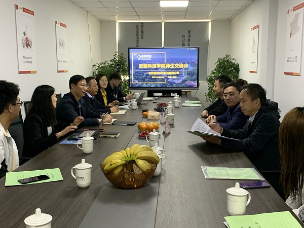 姚勇一行受到公司总经理史景松等热烈欢迎,座谈会上,双方就就实习目的、实习安排、实习内容、实习进度、实习效果等进行了交流,并现场连线了在养殖场实习的学生,交流实习感受。