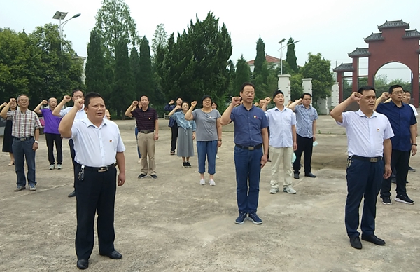 微风细雨绿意浓,位于固镇县任桥镇清凉村的淮北西大门抗战烈士陵园庄严肃穆。汪洋带领党员在纪念碑前肃立,向为中国人民解放事业英勇献身的烈士默哀。面对鲜艳的中国共产党党旗,在汪洋领誓下,全体党员举起右拳,重温入党誓词,铿锵誓言,表达了向革命先烈学习,不忘初心使命的坚定信念和实现崇高理想的坚强决心。