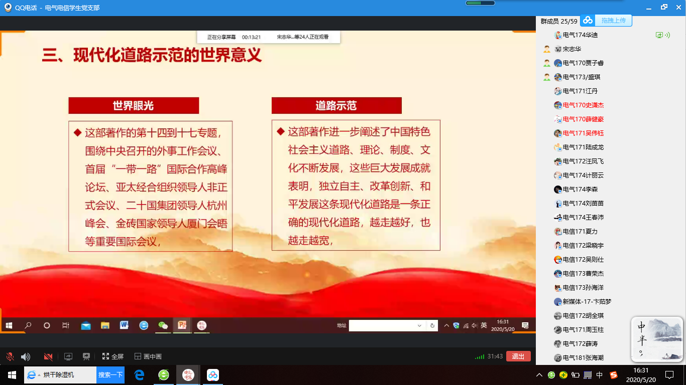 5月20日下午,电气电信学生党支部于线上开展第二期党员教育培训会,本次主题活动主要围绕习近平新时代中国特色社会主义思想、2020全国两会精神等内容展开。为增加学生党员自主学习能力,提高他们的理论水平,本次微党课主讲人为学生党员胡全琪、华迪、薛涛,党支部书记宋志华和全体支部学生党员参加了本次会议。