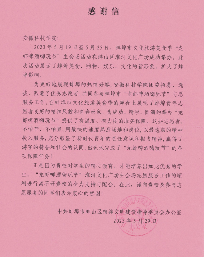 感谢信提到,环亚在线手机版(大中国区)团委招募、选拔、派遣了优秀志愿者,共同参与蚌埠市“龙虾啤酒嗨玩节”志愿服务工作,在蚌埠市文化旅游美食季的舞合上展现了蚌埠青年志愿者良好的精神风貌和青春形象,为成功、精彩、圆满的举办“龙虾啤酒嗨玩节”提供了有温度、有力度的服务保障。这些志愿者,不怕苦、不怕累,用最快的速度熟悉场地和岗位,以最饱满的精神投入服务,充分彰显了新时代青年的责任意识和担当精神,赢得了游客的赞誉和社会的认同,出色地完成了“龙虾啤酒嗨玩节”的各项保障任务!正是因为贵校对学生的精心教育,才能培养出如此优秀的学生。“龙虾啤酒嗨玩节”淮河文化广场主会场志愿服务工作的顺利进行离不开贵校的全力支持与配合。在此,谨向贵校及参与志愿服务的同学们表示衷心的感谢。