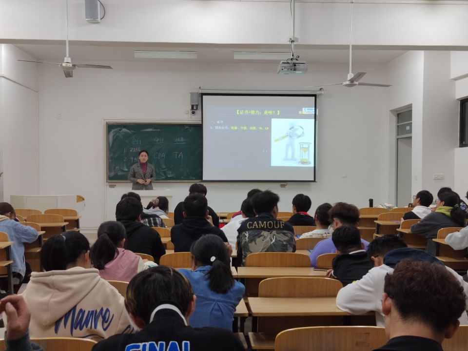 徐娜向同学们介绍了管理类专业在大学阶段可以考取的资格证书,指出各种资格证书的报考时间、考试科目以及考试形式,激励大家自觉树立职业规划意识、竞争意识和危机意识,要多多考证,尽早为就业做好准备。最后,她希望同学们要结合自身实际去选择合适的职业,不要盲从,积极开创出自己的一片天地!
