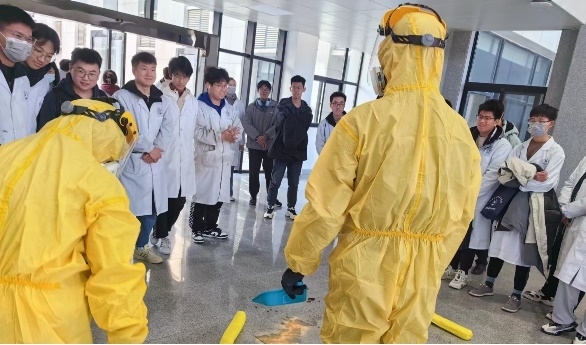 演练模拟某学生在实验过程中,不慎将装有乙醚的容器打碎,导致乙醚泄露。“险情”发生的第一时间,实验老师迅速做出应急响应,紧急组织疏散实验师生,封锁事故现场,清查人数,确认全员安全撤离。经临时成立的应急处理小组安全评估,由两位教师穿戴专业防护装备,进入现场应急处理,用吸附棉吸附收集,再喷洒吸附剂覆盖,收集处理吸附后的垃圾,贴好标签并转移至固体危废垃圾桶。实验室安全演练邀请江苏君源环保科技有限公司总经理、我校应用化学专业2009届校友屈俊勋全程指导讲解。