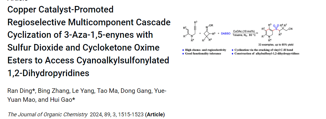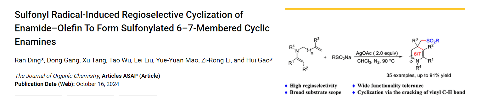 李子荣教授团队在烯胺杂环合成上再次取得重要进展,相关成果以"Copper Catalyst-Promoted Regioselective Multicomponent CascadeCyclization of 3‑Aza-1,5-enynes with Sulfur Dioxide andCycloketone Oxime Esters to Access Cyanoalkylsulfonylated 1,2-Dihydropyridines”(图1)和“Sulfonyl radical-induced regioselective cyclization of enamide−olefin to form sulfonylated 6-7-membered cyclic enamines(图2)为题发表在《The Journal of Organic Chemistry》期刊上。