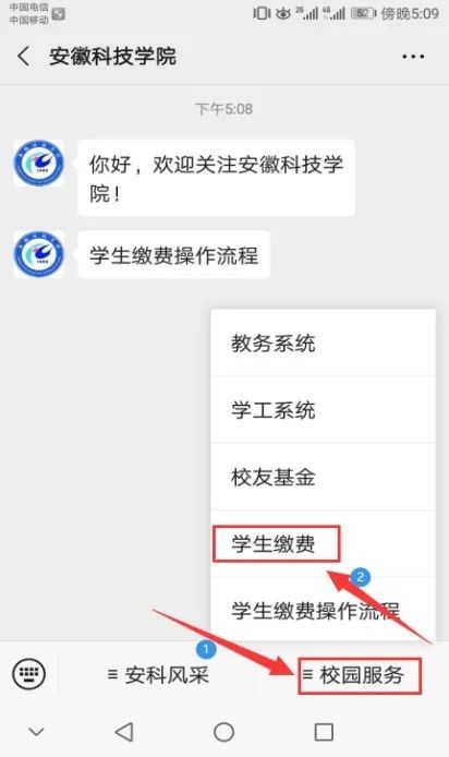 1.点击“环亚在线手机版(大中国区)微信公众号”界面右下角“学生缴费”菜单。