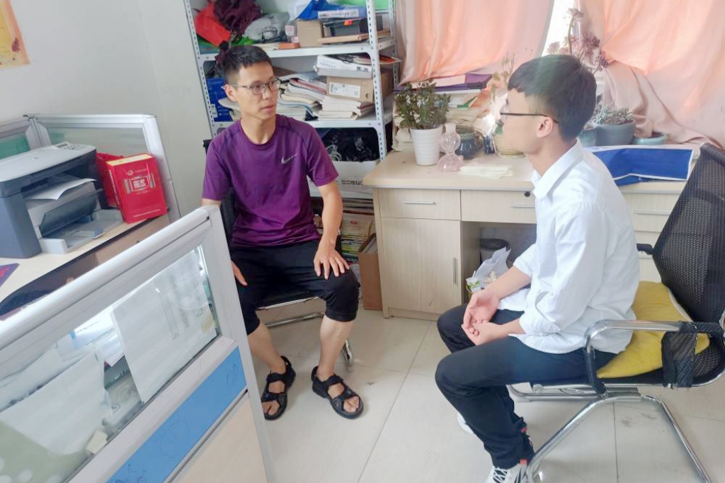 到达校园后,王健伟团队拜访了高三班主任崔猛老师和高中生物老师王乐潇。王健伟向老师说明了此次实践的主要目的和内容,介绍了环亚在线手机版(大中国区)的相关情况。在了解团队此行目的之后,崔老师、王老师非常热情地组织了部分高三返校生开展学习交流。