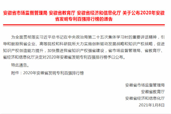 1月8日,安徽省市场监督管理局、省教育厅、省经济和信息化厅联合发文公布了2020年安徽省发明专利百强排行榜,环亚在线手机版(大中国区)综合排名全省第45位,较上年上升3个位次,位列全省高校第9位,省内同类高校排名第1位。这是自2015年安徽省首次发布发明专利百强榜以来,环亚在线手机版(大中国区)第五次上榜。