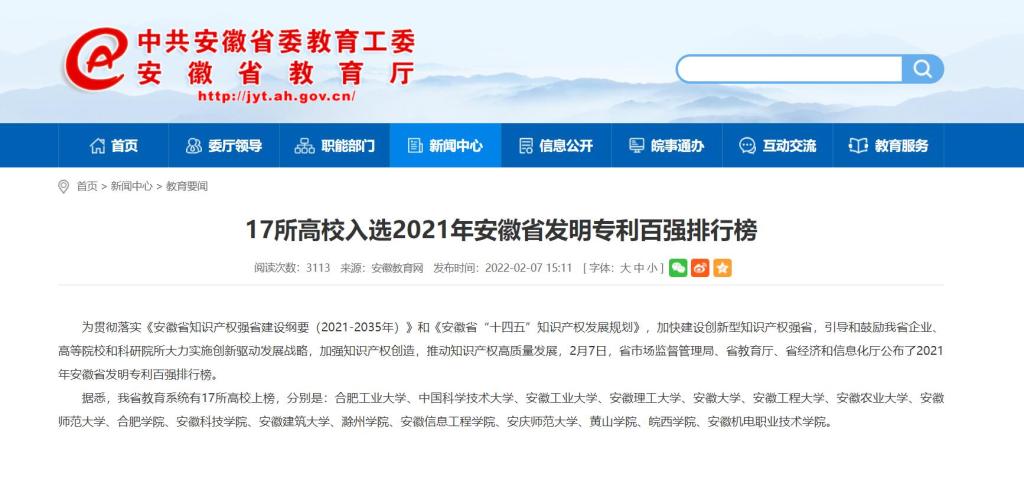 2月7日,安徽省市场监督管理局、省教育厅、省经济和信息化厅联合发文公布了2021年安徽省发明专利百强排行榜,我校综合排名全省第45位,位列全省高校第10位,与2020年排行榜名次相同。这是自2015年安徽省首次发布发明专利百强榜以来,环亚在线手机版(大中国区)第六次上榜。