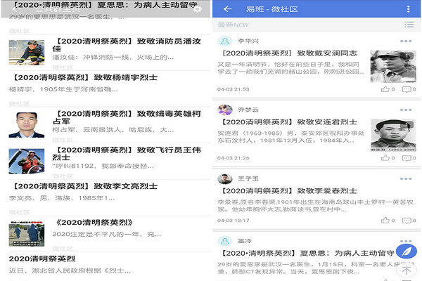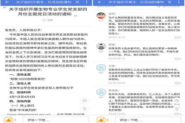 本次缅怀和祭扫活动主要通过三种途径开展,一是登录“中华英烈网”了解英烈事迹,为英烈献花、留言;二是在易班微社区活动通知评论区,通过“三行情书”祭英烈形式,表达敬意和追思;三是在党支部易班群组微社区中分享英烈生平事迹,学习英烈精神,表达崇敬之情,尤其是在此次抗击疫情中牺牲的英雄们的深深感激与崇高敬意。