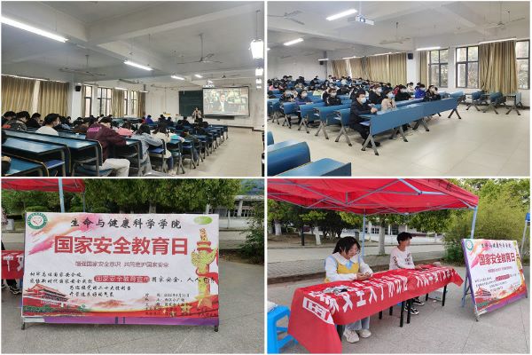 今年4月15日是第七个全民国家安全教育日。为深人贯彻落实有关文件精神,全面深入地抓好安全管理和教育,进一步增强广大师生的安全防范意识,有力推进平安校园、和谐校园建设,4月14日至16日,生命与健康科学学院在西区广场组织开展全民国家安全教育日宣传活动,在新知楼B102教室组织学生集中观看“千万师生同上一堂国家安全教育课”。学院党委副书记彭丽萍,副科级辅导员刘国祥参加活动,19级、20级、21级各班级学生代表佩戴口罩参加活动。