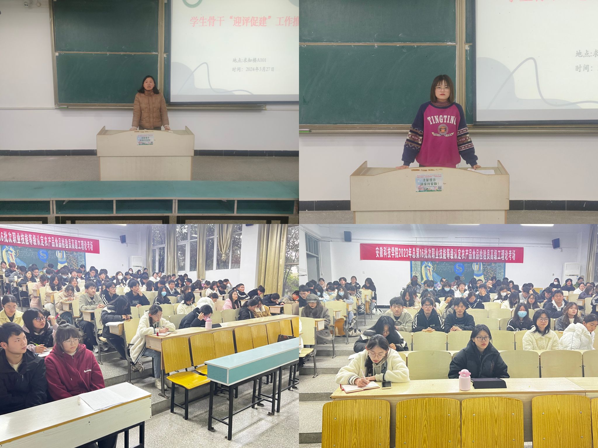 学院党委副书记彭丽萍详细介绍了本科教育教学审核评估的目的、意义以及具体要求,她希望每一名学生都要以主人翁的姿态积极为审核评估做贡献,从日常学风、文明素养、宿舍文化等方面严格自律,展现风采。她对学生骨干提出三点要求,一要统一思想、提高站位。深刻认识审核评估的意义和目的,和学校同心同德、同向同行,以实际行动积极参与审核评估各项工作;二要担起责任、抓好落实。学生组织、各班级要再次召开审核评估专题会议,再次学习审核评估相关知识,严格落实“迎评促建”各项要求;三是示范引领、全员参与。充分发挥学生骨干的示范引领作用,带领全院学生在课堂、宿舍、食堂、学生活动场所等以身作则、举止文明,以实际行动为审核评估做贡献。学院团委书记姜毅就迎审核评估,促优良学风等方面对学生的行为规范、课堂纪律作了详细部署与具体要求。