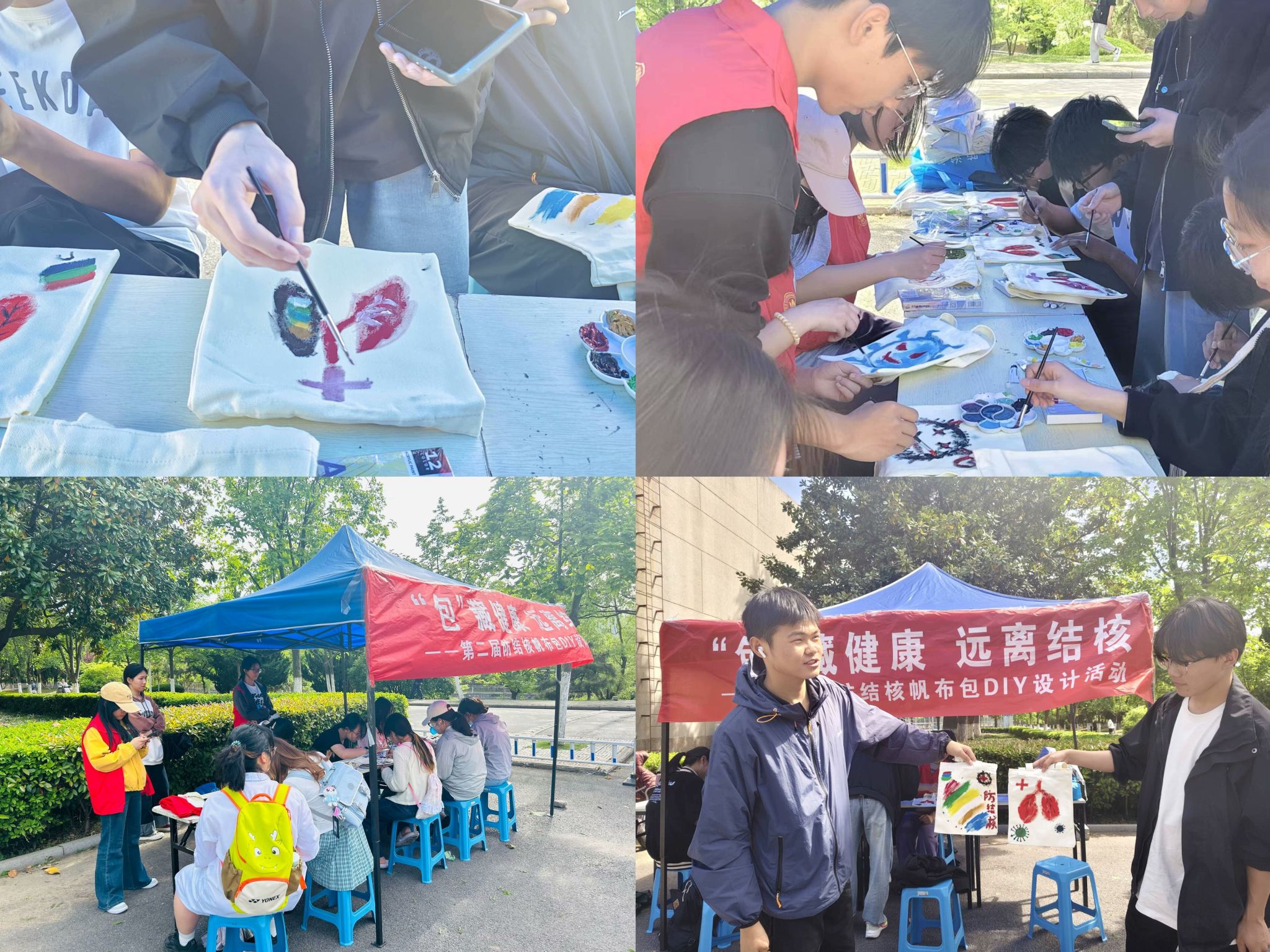 活动现场,学院为参与者提供了帆布包、丙烯颜料等创作工具。同学们充分发挥创意,结合自身专业优势与性格特征,从色彩搭配到图案构思,精心打造每一个帆布包。这些帆布包不仅成为传播健康知识的生动载体,更展现出大学生积极向上的精神风貌。创作完成后,参与者在作品前拍照留念,记录下这份独特的创意成果。所有DIY 帆布包均由创作者自行带走,它们既是实用的物品,又时刻提醒着大家关注结核病防治工作。