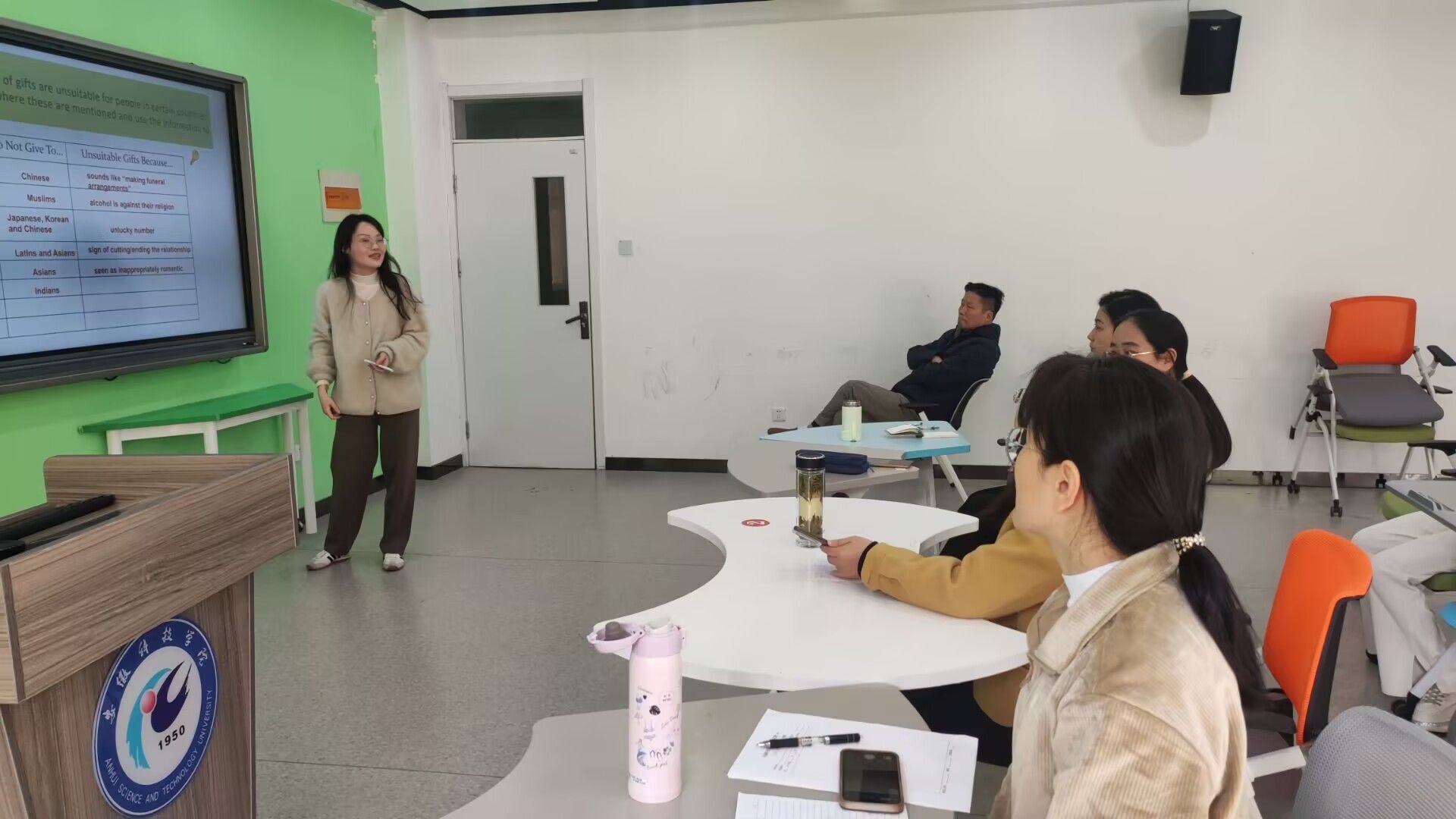 孙玉梅老师与全体老师分享了题为“赠送礼物”的教学设计,她首先提出了语言目标、教学目标、批评思维、文化意识等相关的教学目标,接着陈述了教学过程中的教学方法、教学活动、教学意图。教研室教师认真观摩,踊跃发言,认为孙老师的教学设计目标明确、步骤清晰、衔接流畅、方法得当,同时就课件色彩、呈现方式、内容详略等诸多细节提出了修改意见。