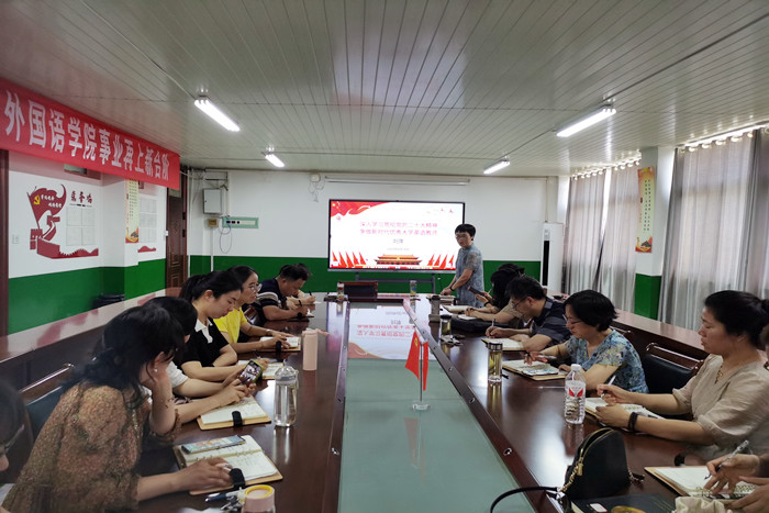 为深入开展学习贯彻习近平新时代中国特色社会主义思想主题教育,认真贯彻落实党的二十大精神,全面把握党的二十大报告中关于教育重要论述的深刻内涵,6月14日下午,外国语学院党委副书记、院长刘萍以《深入学习贯彻党的二十大精神,争做新时代优秀大学英语教师》为题讲授专题党课。专题党课由学院党委书记蔡为青主持,大学英语第一教研室教工党支部、大学英语第二教研室教工党支部全体党员聆听党课。
