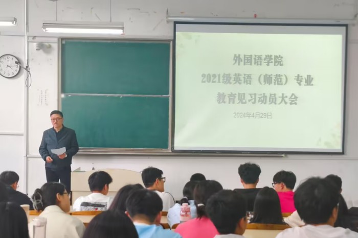 为扎实做好2021级英语(师范)专业见习工作,引导学生以良好的精神风貌迎接见习,4月29日下午,外国语学院在求知楼A203教室举行2021级英语(师范)专业教育见习启动大会。2021级英语(师范)专业全体学生参加本次会议。外国语学院党政领导和有关教师出席会议,会议由学院副院长洪民主持。