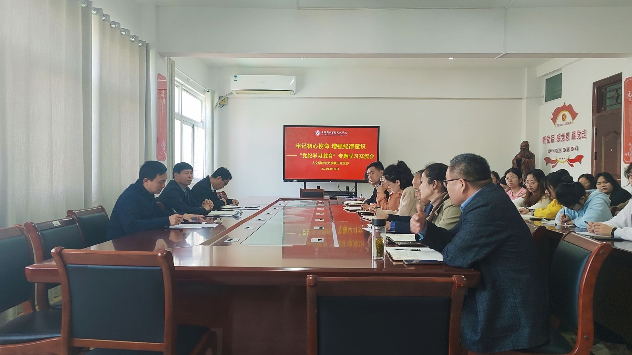 4月18日上午,根据学校党委关于开展党纪学习教育统一部署和人文学院党委《关于组织全体党员集中研读<中国共产党纪律处分条例>条文的通知》(以下简称《条例》),人文学院中文系教工党支部在学知楼324党员活动室召开党纪学习教育专题学习会,校党委书记时伟到会指导。人文学院中文系教工党支部和汉语言文学专业学生党支部全体党员参加,法学系教工党支部书记、系主任张晓云列席。会议由中文系教工党支部书记和建伟主持。