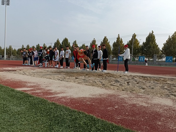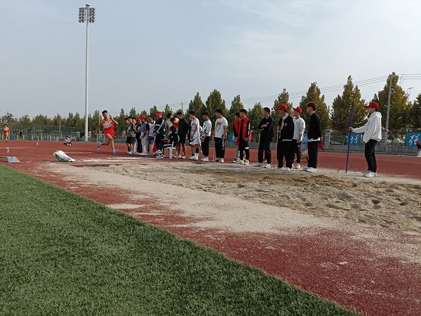 助跑,跳!他真的飞起来了!围观的同学们不时发出阵阵叫好声。在平时的训练中,曹震从不叫苦,从不喊累,积累了丰富的经验,才得以在第三跳中跳出6.42米的成绩摘得桂冠,并一举打破记录。