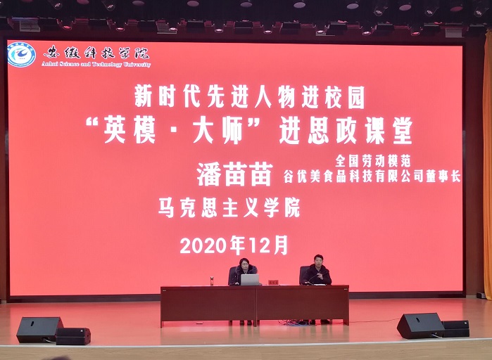全国劳动模范、安徽省优秀共产党员、安徽省三八红旗手、安徽青年五四奖章获得者、安徽谷优美食品科技有限公司董事长潘苗苗走进思政课堂,以“开阔创业之路,照亮精彩人生”为题应邀为龙湖校区2019级300多名大学生做了作主题报告。马克思主义学院班子成员、部分思政课教师聆听报告会。马克思主义学院院长张德化主持报告会。