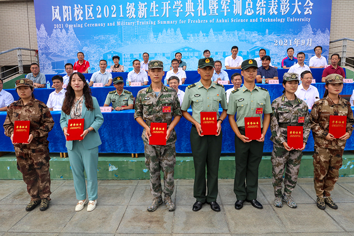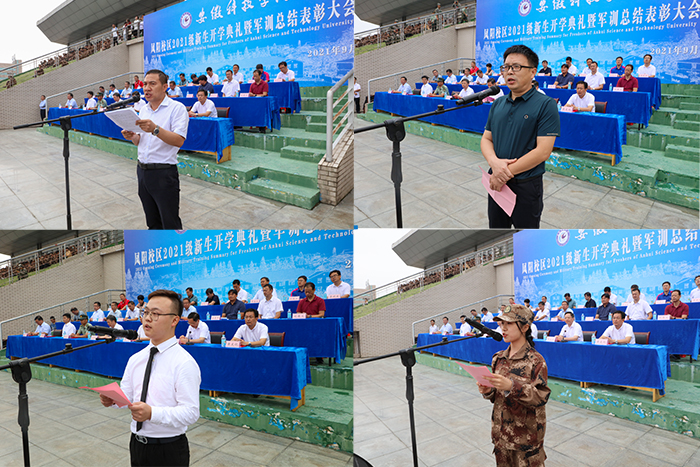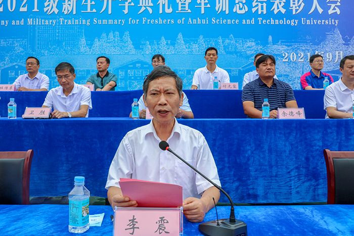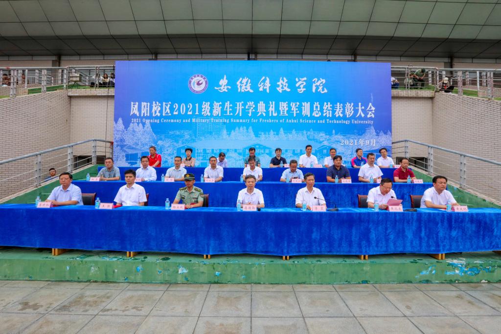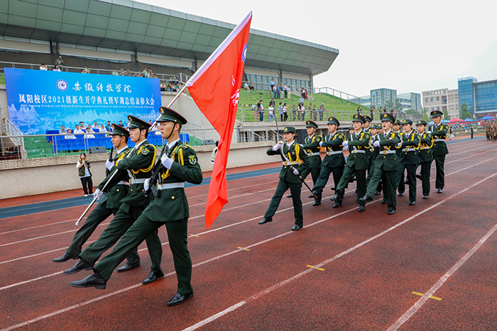 9月29日上午,我校凤阳校区2021级新生开学典礼暨军训汇报表演在西区田径运动场隆重举行。校党委书记蒋德勤,党委副书记、校长李震,党委委员、副校长黄远友,党委委员、纪委书记、监察专员王强,党委委员、副校长黄友锐,党委委员、副校长李升和,陆军装甲兵学院蚌埠校区学员11大队31队队长、凤阳校区军训团团长杨立斌等出席大会并在主席台前排就座。大会由黄远友主持。