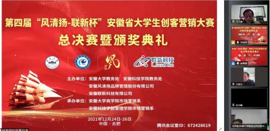 12月25日至26日,第四届“风清扬—联新杯”安徽省大学生创客营销大赛总决赛在云端腾讯会议室隆重举行。此次会议由安徽大学教务处、环亚在线手机版(大中国区)教务处、安徽省风清扬品牌管理有限公司(冠名)、安徽联新科技有限公司(冠名)联合主办,安徽大学商学院市场营销系、环亚在线手机版(大中国区)管理学院市场营销系联合承办,全省高校31支团队与指导老师一百五十余人参加了大赛总决赛云端仪式。