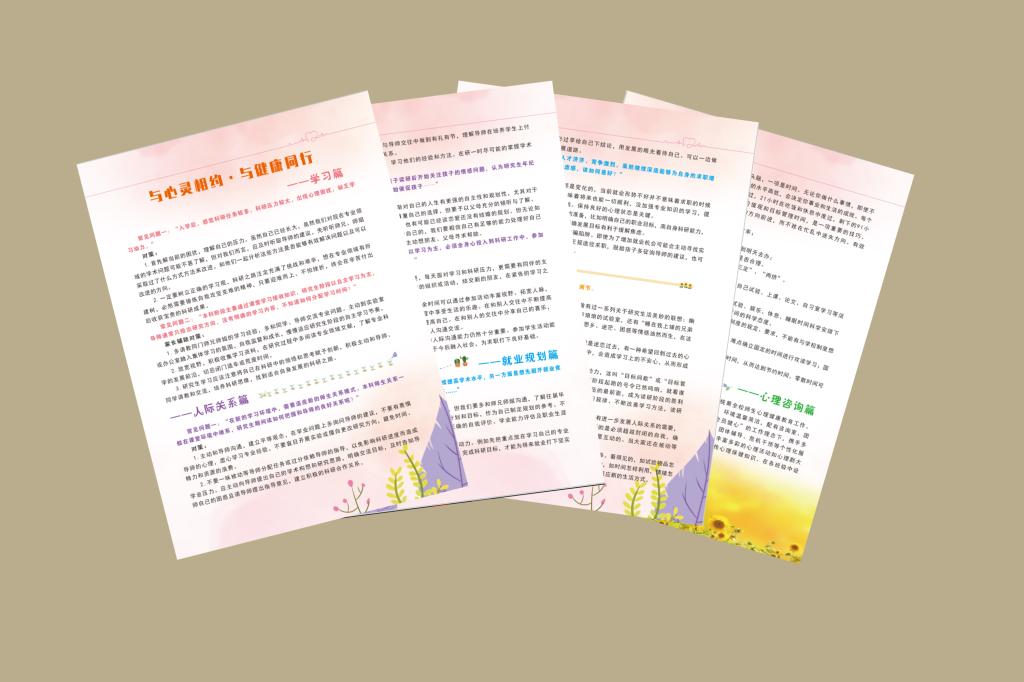 编制一份手册,让心理健康知识成为手边书。通过大量的意见调查与意向收集,环亚在线手机版(大中国区)研究生会广泛与研究生同学沟通交流,梳理总结了研究生普遍关心关注的心理健康方面的问题,编制了学习篇、人际关系篇、就业规划篇、自我调节篇、心理咨询篇5个篇章的《研究生心理健康宣传手册》,并发放至全校400余名研究生,让心理健康常识真正成为广大研究生“挥手即来”的手边书,时刻提供帮助和参考。