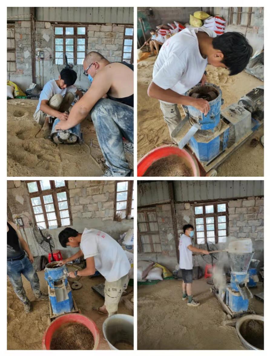 之后根据厂里实际情况,帮助研制鹅场颗粒配合饲料的设备。高温、设备故障、水分比例等都会成为影响饲料制粒速度和质量的因素。经过一段时间的研究与实验,成功研制颗粒饲料的配置设备,这让团队成员劲头大增,成就感和学习热情高涨。他们不顾炎热,在各种鹅种身上进行饲喂试验,考察饲料的适口性,取得了预期效果。同时,也让团队成员们深切感受到,从想法到产品的过程之艰辛,从理论到实际生产的不易。