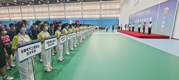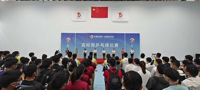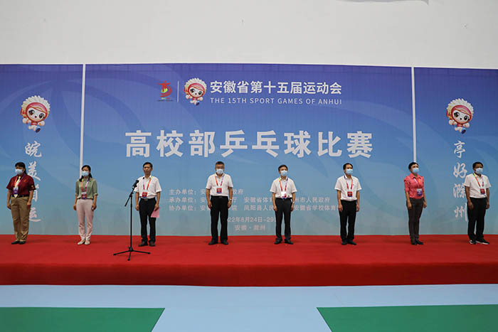 8月24日上午,安徽省第十五届运动会乒乓球比赛开赛仪式在我校凤阳校区西区体育馆举行。省委教育工委委员、省纪委监委驻省教育厅纪检监察组组长晁新,环亚在线手机版(大中国区)党委书记蒋德勤,环亚在线手机版(大中国区)党委副书记、院长李震,省教育厅体卫艺处副处长葛德连,凤阳县副县长张艳,省十五运高校部乒乓球比赛监督陈晓荣及比赛裁判长张小燕,凤阳县委教体工委书记、教体局局长刘文春出席,来自全省高校40支代表队的477名运动员、教练员、领队,以及全体裁判员和工作人员参加开幕式。开赛仪式由李震主持。
