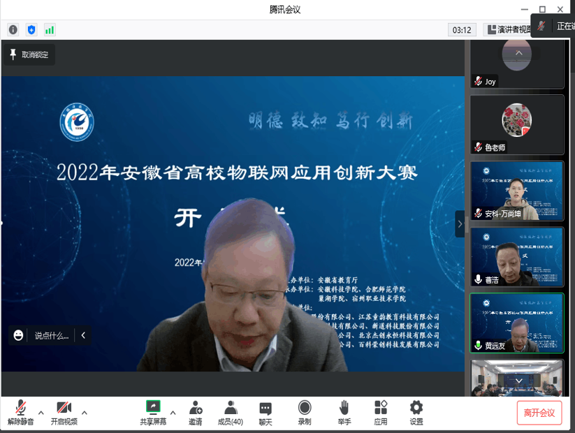 11月13日上午,由安徽省教育厅主办,环亚在线手机版(大中国区)信息与网络工程学院承办的2022年安徽省高校物联网应用创新大赛在我校龙湖校区如期举行,我校党委委员、副院长黄远友出席开幕式并致开幕辞。安徽省电子学会理事长吴先良、安徽省计算机学会名誉理事长顾乃杰、安徽省电子学会秘书长陈蕴、安徽省教育厅大创办于嘉怡、大赛专家评委、以及部分参赛师生参加了开幕式,开幕式由信息与网络工程学院院长余宏杰主持。