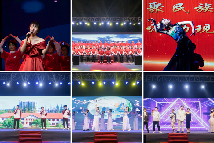 晚会演出分为“扶云月 舞乾坤”“迎盛世 驰远航”“携青春逐星河”三个华丽篇章,以歌曲、舞蹈、朗诵、舞台剧等多种艺术表现形式呈现,精彩汇聚,激情飞扬。合唱《歌声与微笑》《夜空中最亮的星》唱着青春的梦想,带着年轻的底气与冲劲,向每一颗年轻的心展示着热爱的力量;手势舞《灯火里的中国》和朗诵《亲爱的祖国》表达出了广大学子对祖国的深情热爱;舞台剧《美丽中国》展示了不同民族文化的独特与多彩;古典舞《青丝红袖》配合古筝《声声慢》带着现场观众感悟诗词意境;走秀《魅力舞台》以及舞蹈《青春有你》生气蓬勃,充分展现了食院学子青春朝气。整场晚会在师生共同欢唱《年轻的朋友来相会》中圆满结束。