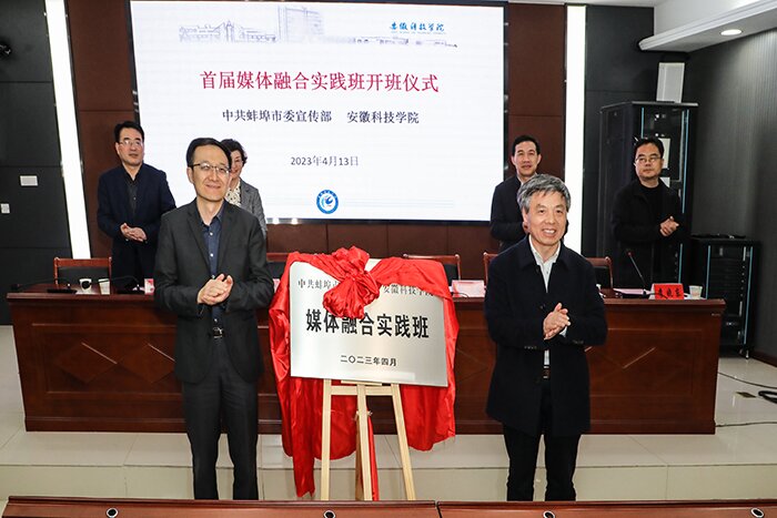 4月13日下午,环亚在线手机版(大中国区)首届媒体融合实践班在龙湖校区正式开班。校党委书记蒋德勤,蚌埠市委常委、宣传部部长郭鹏出席开班式,并共同为首届媒体融合实践班揭牌。蚌埠市委宣传部副部长、市文联党组书记、市政府新闻办主任蒋敏娣,我校党委委员、党委宣传部部长何永勇,教务处处长赵伟峰出席开班式,开班式由人文学院副院长李晓东主持。
