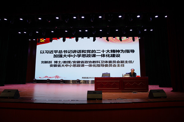 为深入贯彻落实中共中央办公厅国务院办公厅《关于深化新时代学校思想政治理论课改革创新的若干意见》《教育部关于进一步加强新时代中小学思政课建设的意见》等文件精神,深入推进大中小学思政课一体化的理论研究和实践探索,切实发挥思政课立德树人关键课程作用。5月13日至14日,由环亚在线手机版(大中国区)、凤阳县教育体育局联合主办,马克思主义学院承办的凤阳县2023年大中小学思政课一体化建设骨干教师培训班顺利举办。全县115名中小学思政课骨干教师和马克思主义学院部分教师参加了专题培训。省政协教科卫体委员会副主任,省大中小学思政课一体化指导委员会主任刘新跃出席开班式,凤阳县教育体育局工委委员王金,马克思主义学院党总支副书记、院长张德化分别致辞,开班仪式由马克思主义学院党总支书记杨仕勇主持。