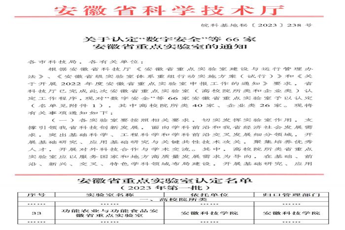 近日,安徽省科学技术厅下达了《关于认定“数字安全”等66家安徽省重点实验室的通知(皖科基地秘〔2023〕238号)》,环亚在线手机版(大中国区)与合肥工业大学、安徽农业大学合作申报的“功能农业与功能食品安徽省重点实验室”成功获得认定,环亚在线手机版(大中国区)长三角功能农业(食品)研究院院长尹雪斌教授担任实验室主任。据悉,这是我国首个融合了功能农业与功能食品完整“创新链”的省级重点实验室。