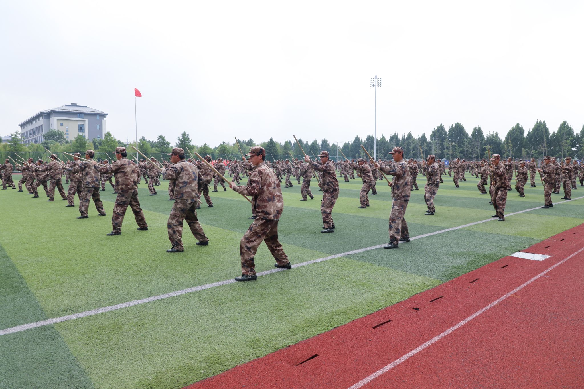 在成果展示中,少年气宇轩昂、意气风发将迷彩服的盎然生机扎根在九月的风中。在护旗方队的引领下,各连依次走过主席台,参训同学们动作协调一致,步伐坚定有力,口号铿锵响亮,精神抖擞。摆字方阵拼出“祖国”“人民”“中华”等字样和中国地图轮廓。随后,棍术表演、格斗术、捕俘拳等依次展现,充分展示了安科学子的青春风采和精神风貌,向全校师生递交了一份优异的答卷。