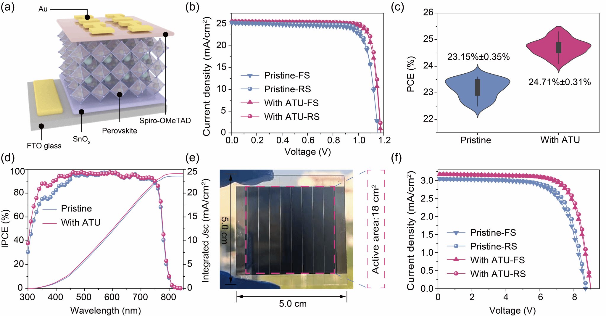 该成果创新设计多功能硫脲衍生物——脒基硫脲(ATU)作为添加剂,通过胍基N-H基团与甲脒阳离子形成强氢键、硫脲基团C=S键与未配位Pb2+形成稳定配位键,实现钙钛矿结晶精准调控与缺陷高效钝化。