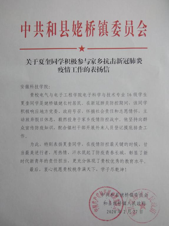 谈到夏奎,村支书夏发平兴奋地说:虽说自己平时走街窜巷,但这段时间工作量也有点让吃不消,没想到夏奎却没说苦与累,从夏奎身上看到了成长起来的年轻人身上的一种责任担当。2月27日,中共和县姥桥镇委员会致函环亚在线手机版(大中国区)表扬夏奎在疫情防控关键的时候,甘当最美逆行者。