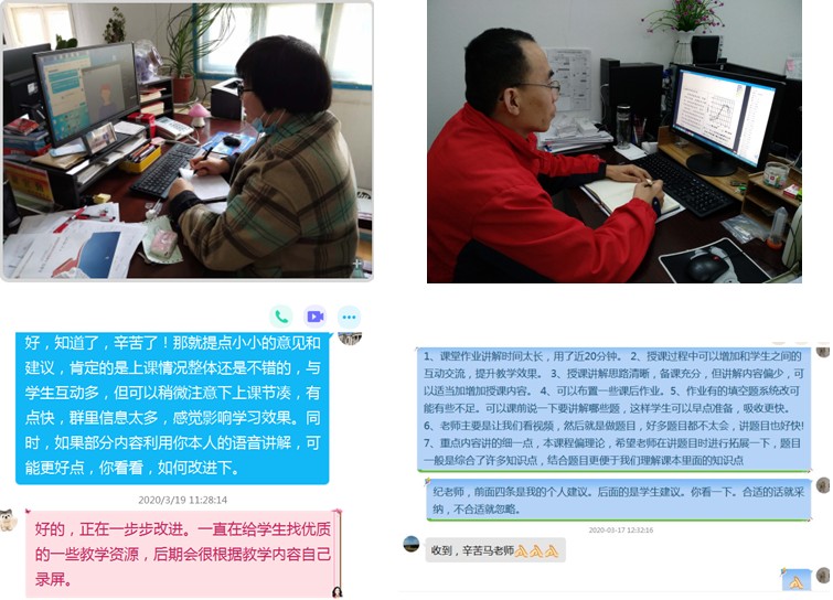 强化质量监督,保障教学成效。自3月2日线上教学开始后,学院教学督导组在督导组组长谢宜勤领导下有序开展在线教学督导。一是对在照教学任务,对教师授课平台进行检查。二是组织开展在线教学听课。三是通过学生信息员了解在线教学情况。听课结束后,对在线教学中发现的问题及时处理,及时与授课教师进行沟通与交流。开展学生在线教学学习情况意见征询,听取学生的评价、建议,及时汇总反馈任课教师。同时每周将教学督导情况及时反馈给学校督导办公室,加强在线教学的质量监控。