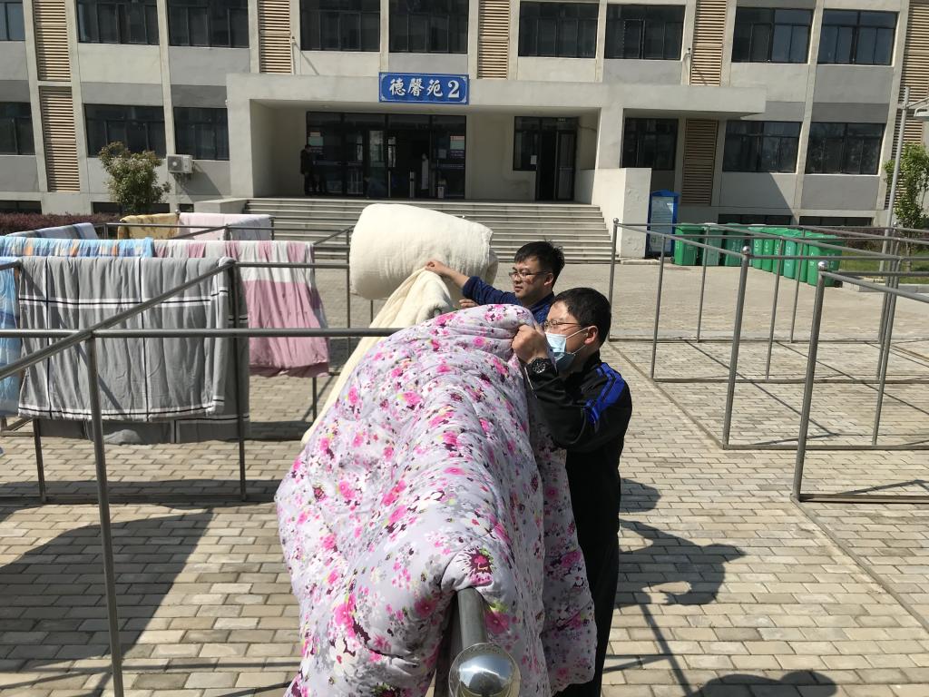“老师,宿舍几个月没有通风了,被子都该长蘑菇了,怎么办啊?”“老师,我们宿舍在阴面,平时就潮,被子上应该有很多霉菌了,呜呜呜……” 这个特殊的寒假,学生们纷纷牵挂起自己的寝室,特别是几个月没有晾晒过的被褥。学院早已考虑到了学生们的需求,组织开展了线上下单,线下被“宠”服务。通知下发一天,学院就接到了95份“晒被订单”,并于4月24日和28日组织辅导员和教工党员志愿者组成多个晒被小分队,在公寓管理服务中心领导和员工的协助下,分组进入宿舍楼,将学生的被褥做上标记拿到楼下晾晒区进行晾晒,同时还为学生寝室通风透气,浇灌绿植,并将腐败的垃圾进行清除。