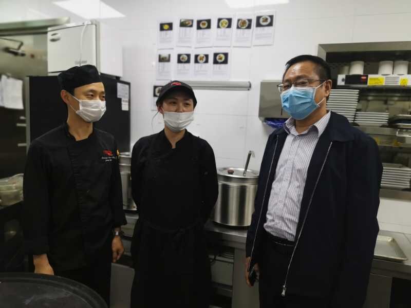 在蔡嘉和摩尔顿,杜传来看望了在岗实习学生,详细了解了学生疫情期间生活、学习和工作情况,实地参观了实习单位及学生生活居住环境,并就学生的实习收获、心得体会、未来职业规划等进行了座谈交流。学生们纷纷表示,疫情期间,由于餐饮配送的特殊性,学生们在防护安全保障的情况下,很多时间仍坚守在实习岗位一线,虽然很苦很累,却是一次难得的实践和奉献机会,能为疫情隔离困境下的人们提供基本的饮食生活保障,他们也感到无比的荣耀。同学们说:“我们就是疫情期间那批打不死的小强,明天会更好,中国会更好,中国加油!”