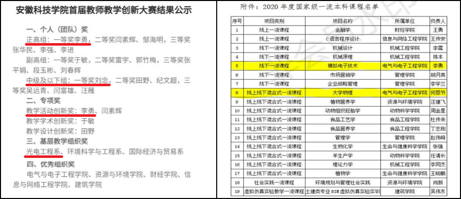 一直以来,光电工程系教工党支部注重加强支部建设,经过支部党员和教师的共同努力,在一流专业建设、一流课程申报、教师教学创新大赛、科研成果、教书育人等方面取得显著成效。光电工程系教工样板支部建设成果颇丰,光电信息科学与工程专业成功获批为省级一流建设专业,《模拟电子技术》与《大学物理》课程被推荐为国家一流建设课程,刘念获得学校首届教师课程思政教学大赛一等奖,李勇、刘念分别获得首届环亚在线手机版(大中国区)高校教师教学创新大赛正高组一等奖、讲师组一等奖,刘念获得首届安徽省高校教师教学创新大赛现场赛入围资格,党支部基本上每位党员教师均有在研高质量科研教研项目,左绪忠获批的国家自然科学基金项目现已结题验收,实现了电气与电子工程学院国家自然科学基金零的突破,教师发表高质量SCI学术论文一区2篇、二区4篇、三区3篇、四区2篇,教师指导学生参加国家级大学生物理实验大赛获奖4项,学生考研率逐年递增,学生学风建设取得成效等。