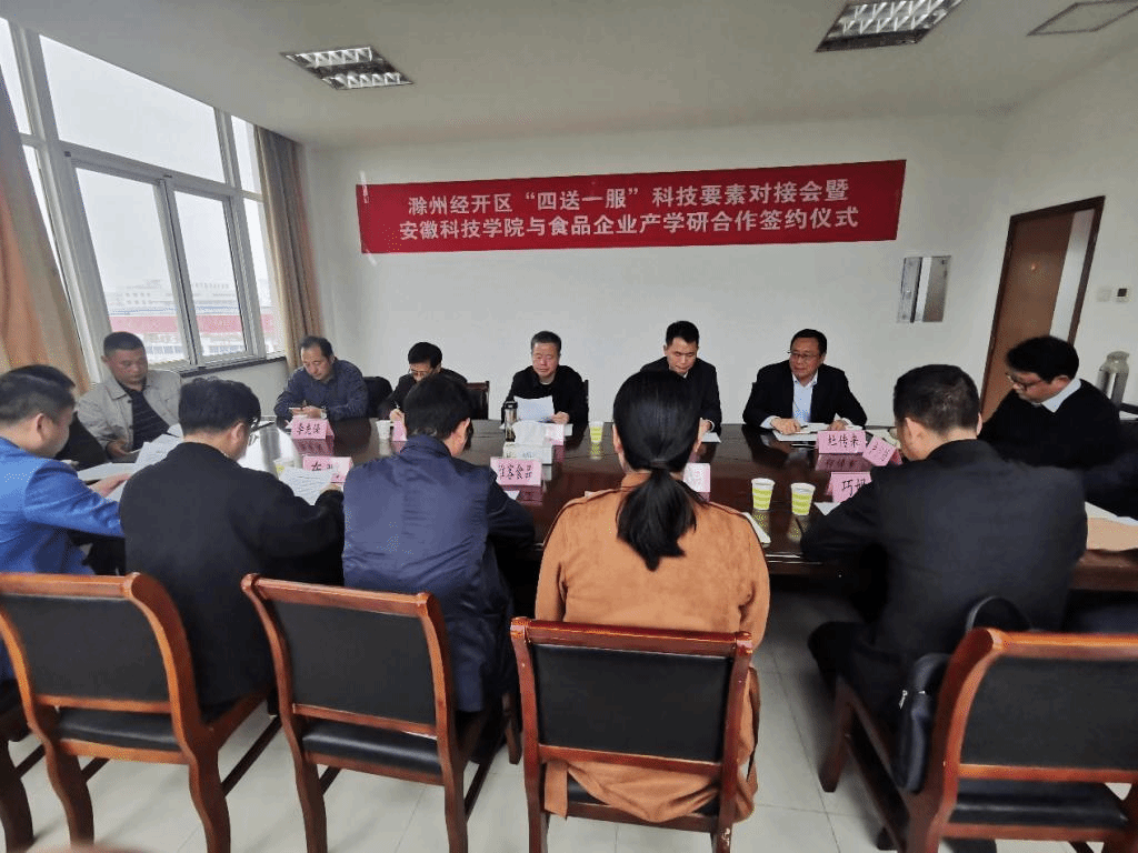 4月22日下午,在滁州经开区管委会四楼会议室举行滁州经开区“四送一服”科技要素对接会暨环亚在线手机版(大中国区)与滁州经开区食品企业产学研合作签约仪式。我校食品工程学院院长杜传来、服务地方发展研究院院长詹秋文、特色农产品加工研究所所长李先保及彭钢、马菲菲两位专任教师参加此次对接会及签约仪式。滁州市经信局副局长张正强、滁州市科技局总工程师卢少悟、滁州经开区管委会副主任潘金钟、滁州经开区企业服务中心主任刘钊以及安徽盼盼食品有限公司、安徽银鹭食品有限公司、安徽东鹏饮料有限公司、安徽巧妈妈食品科技有限公司、雅客食品(滁州)有限公司的代表等出席签约仪式,仪式由滁州经开区管委会副主任潘金钟主持。
