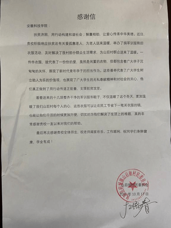 本次军训服捐赠活动在与山后街村党支部书记左培春协商后,以围绕“浓浓敬老情,衣旧暖人心”的主题全面展开,经过前期活动策划、新生军训期间宣传动员以及军训后再次组织线下募捐,共获募捐军训服装240余件,募捐的衣物全部赠送到山后街村的村民手中。
