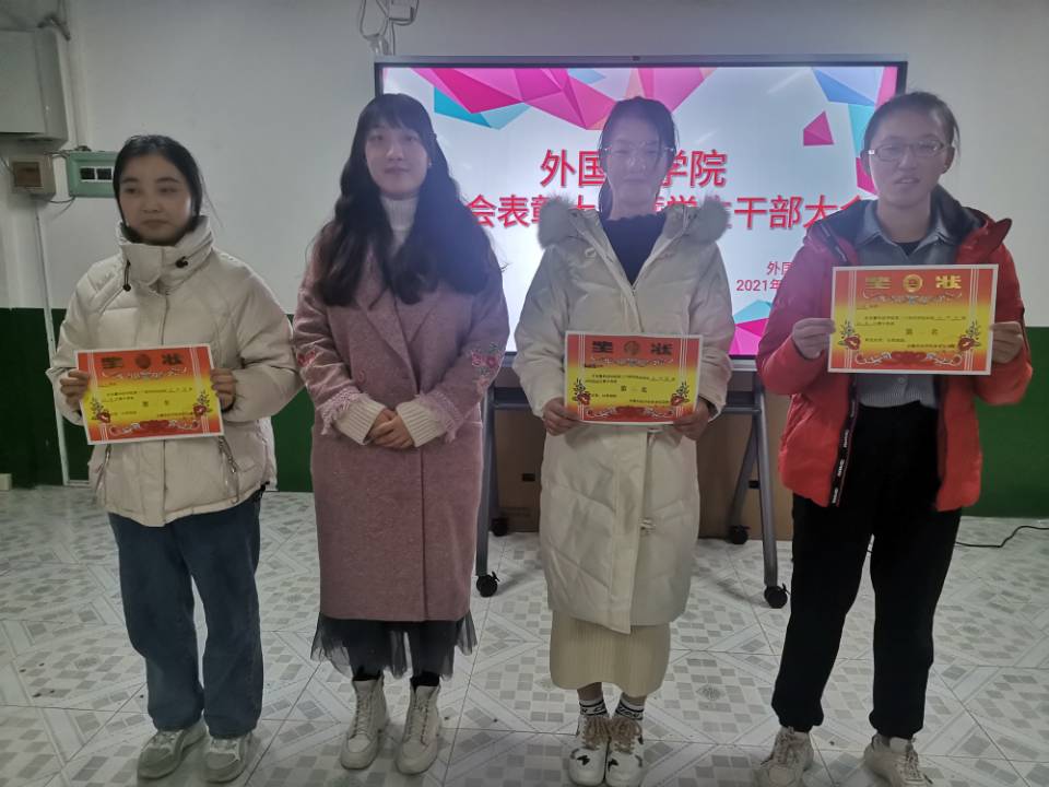 在干部大会上,陈慧中、宋兵兵、张薇薇分别布置了各自分管的工作,如:奖学金使用管理、安科E创项目申报、安全稳定、疫情防控、学风建设、意识形态、外语文化节闭幕式晚会、学籍异动等内容。在表彰会议上,与会老师们为获奖运动员颁发奖状并合影留念。宋兵兵宣读了《外国语学院学生在环亚在线手机版(大中国区)第30届运动会的通报表扬名单》,张薇薇宣读《外国语学院在校第30届运动会中获奖运动员名单》,院学生会执行主席桂纪昌对本次校运动会进行了总结发言。