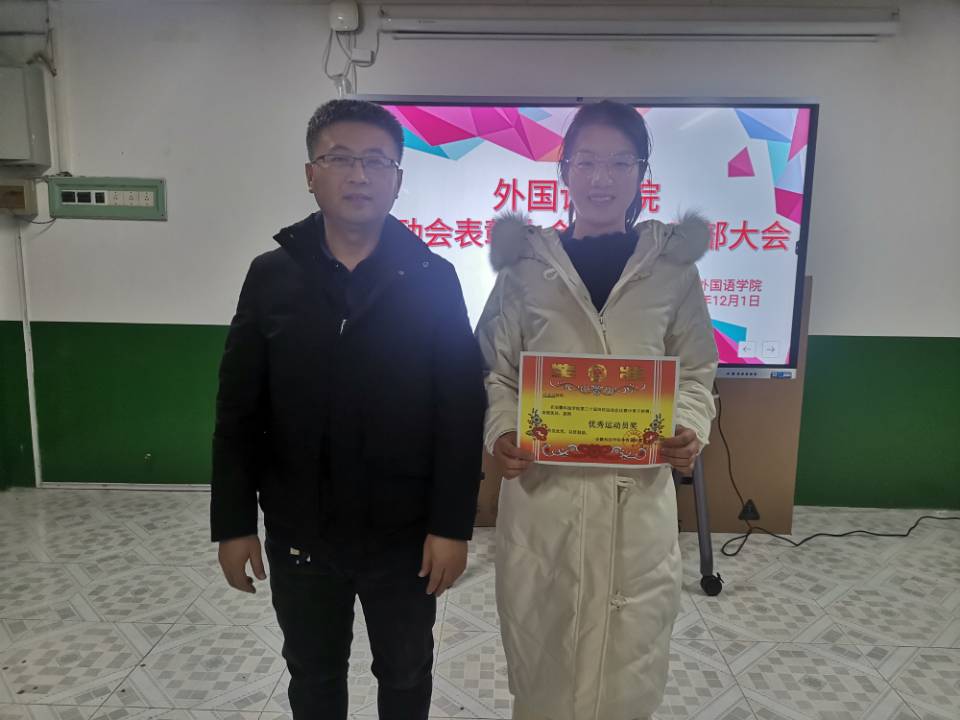 在干部大会上,陈慧中、宋兵兵、张薇薇分别布置了各自分管的工作,如:奖学金使用管理、安科E创项目申报、安全稳定、疫情防控、学风建设、意识形态、外语文化节闭幕式晚会、学籍异动等内容。在表彰会议上,与会老师们为获奖运动员颁发奖状并合影留念。宋兵兵宣读了《外国语学院学生在环亚在线手机版(大中国区)第30届运动会的通报表扬名单》,张薇薇宣读《外国语学院在校第30届运动会中获奖运动员名单》,院学生会执行主席桂纪昌对本次校运动会进行了总结发言。