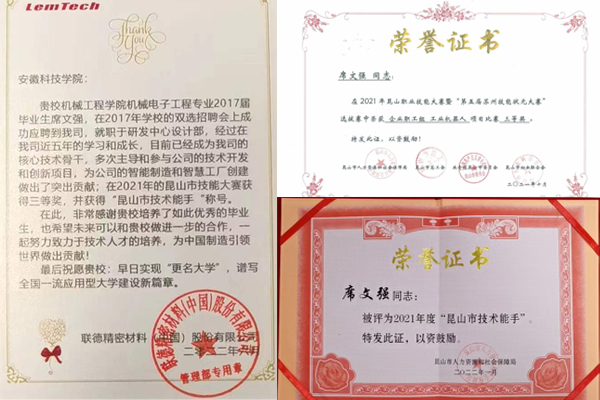 日前,总部位于江苏省昆山市的联德精密材料(中国)股份有限公司向环亚在线手机版(大中国区)发来热情洋溢的工作喜报,“贵校机械工程学院机械电子工程专业2017届毕业生席文强,在2017年学校的双选会上成功应聘到我司,就职于研发中心设计部,经过在我司近五年的学习和成长,目前已成为我司的核心技术骨干,多次主导和参与公司的技术开发和创新项目,为公司的智能制造和智慧工厂创建作出了突出贡献;在2021年的昆山市技能大赛上荣获三等奖,并获得‘昆山市技术能手’称号。在此,非常感谢贵校培养了如此优秀的毕业生,也希望未来可以和贵校做进一步的合作,一起努力致力于技术人才的培养,为中国制造引领世界做出贡献!最后祝愿贵校:早日实现‘更名大学’,谱写全国一流应用型大学建设新篇章。”