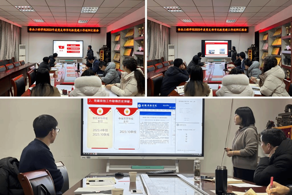 12月29日下午,食品工程学院召开2023年度党支部书记抓党建工作述职汇报会。学院党委书记付光玺出席并主持会议,副院长翟立公列席指导,食品营养与安全系教工党支部、食品科学与工程学生党支部等7个党支部的支部书记参加述职汇报。