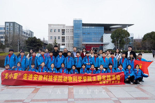 3月13日,在共青团蚌埠龙子湖区委的组织下,蚌埠工农小学师生一行35人来到我校凤阳校区参观研学。在学校团委大力支持下,孩子们先后前往动物科学学院附属兽医院、动物科学学院动物标本馆、我校省级非物质文化遗产教育传承基地进行参观。