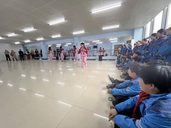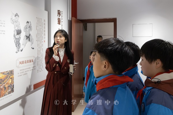 在凤阳花鼓教育传承基地中,学生们参观了学校凤阳花鼓创新成果展厅、文化长廊,了解凤阳花鼓的历史渊源、文化内涵、价值底蕴,感知中华传统文化的魅力。近距离欣赏了学校花鼓队同学的表演,感受中华非遗的独特魅力,增强中华传统文化的自信认同。
