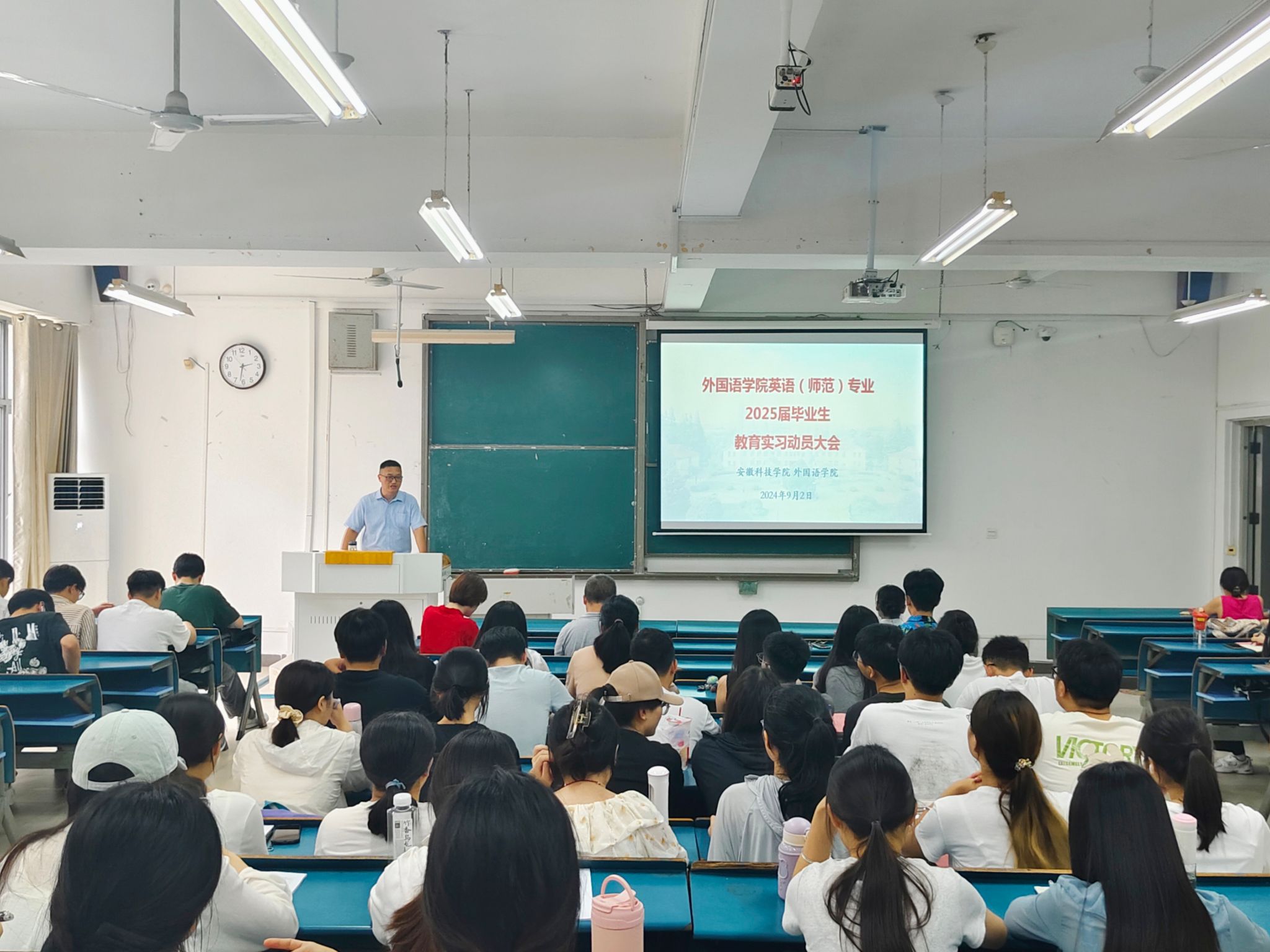 为构建师范生全方位教育实践内容体系,持续推进教育见习、实习与研习的深度贯通,9月2日下午,外国语学院在新知楼A104教室举行教育实习动员大会,2021级英语(师范)专业全体学生参加本次会议。外国语学院党政领导和有关教师出席会议,会议由副院长洪民主持。