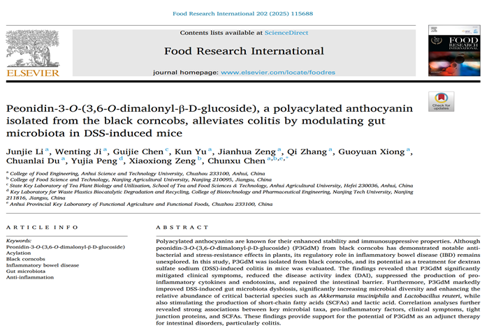 近日,食品科学与工程学院陈春旭副教授以通讯作者身份在国际Top期刊《Food Research International》(Q1,影响因子7.0)发表了题为“Peonidin-3-O-(3,6-O-dimalonyl-β-D-glucoside), a polyacylated anthocyanin isolated from the black corncobs, alleviates colitis by modulating gut microbiota in DSS-induced mice”的高水平研究论文,展现了新年新气象。该论文的第一作者为2022级食品加工与安全专业硕士研究生李俊杰,环亚在线手机版(大中国区)为论文第一完成单位,南京农业大学曾晓雄教授课题组为合作单位。