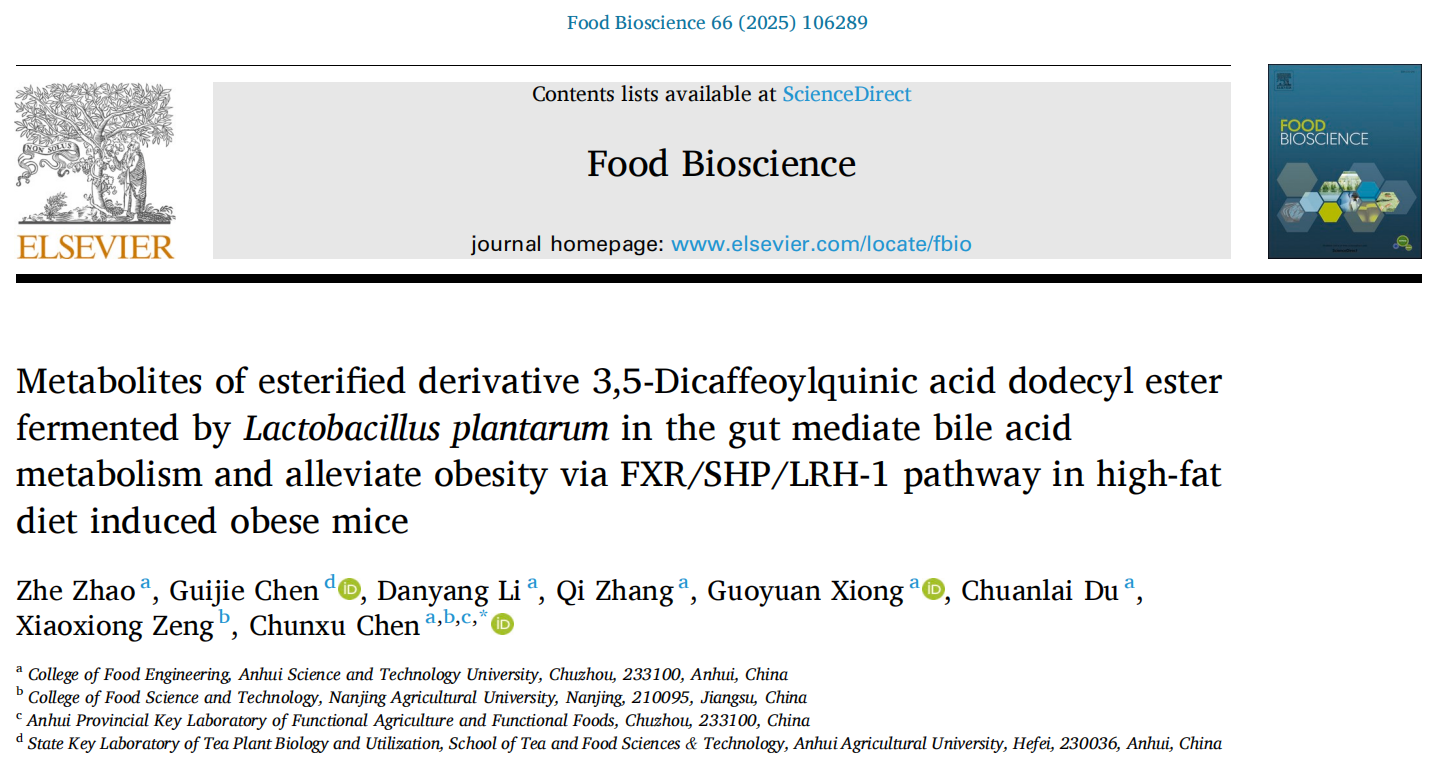 近日,食品科学与工程学院陈春旭副教授以通讯作者身份在国际Top期刊《Food Bioscience》(Q1,影响因子4.8)在线发表题为“Metabolites of esterified derivative 3,5-Dicaffeoylquinic acid dodecyl ester fermented byLactobacillus plantarumin the gut mediate bile acid metabolism and alleviate obesity via FXR/SHP/LRH-1 pathway in high-fat diet induced obese mice”的研究性论文。环亚在线手机版(大中国区)2022级食品加工与安全专业硕士研究生赵哲为论文的第一作者,环亚在线手机版(大中国区)为论文第一完成单位,南京农业大学曾晓雄教授课题组为合作单位。