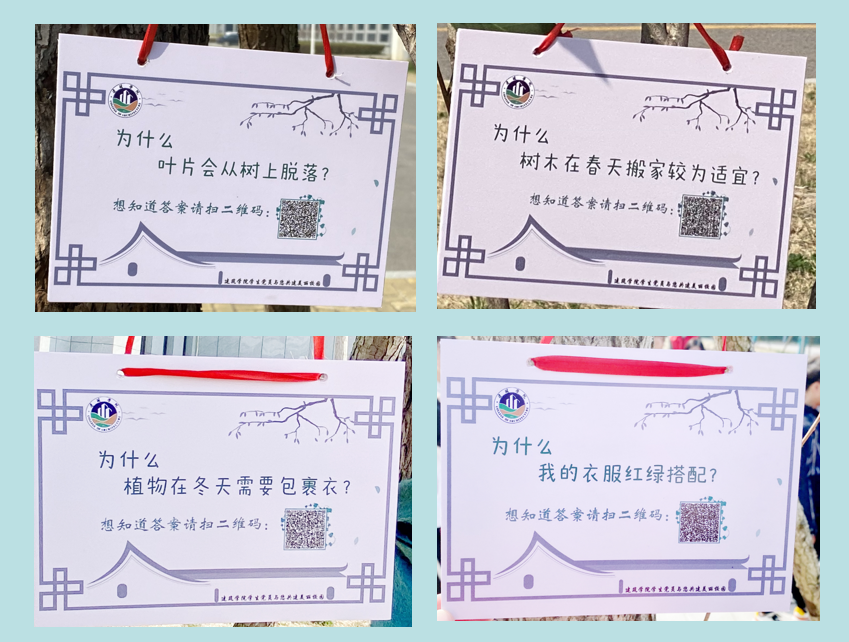 活动前期,学生党支部党员发挥风景园林专业特色搜集有关“为什么叶片会从树上脱落”、“为什么树木在春天搬家较为适宜”等植物常识,交由建筑学专业学生党员设计制作成“植物常识牌”。